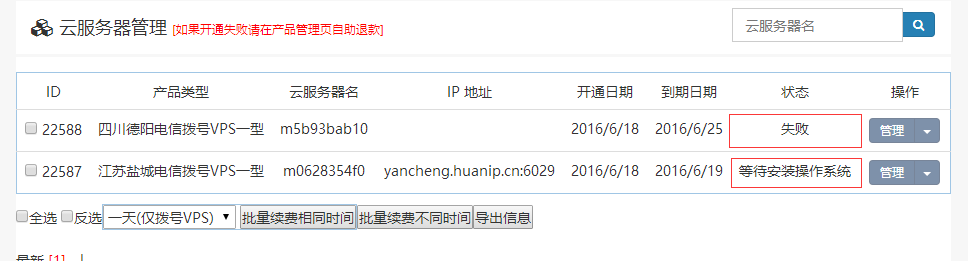 ⑤我们点击状态为“失败”的VPS产品后面的管理按钮,进入管理详细页,点击“开通失败自助退款”,按照流程操作即可自助将开通失败的产品的金额退还到你的用户账户内。
