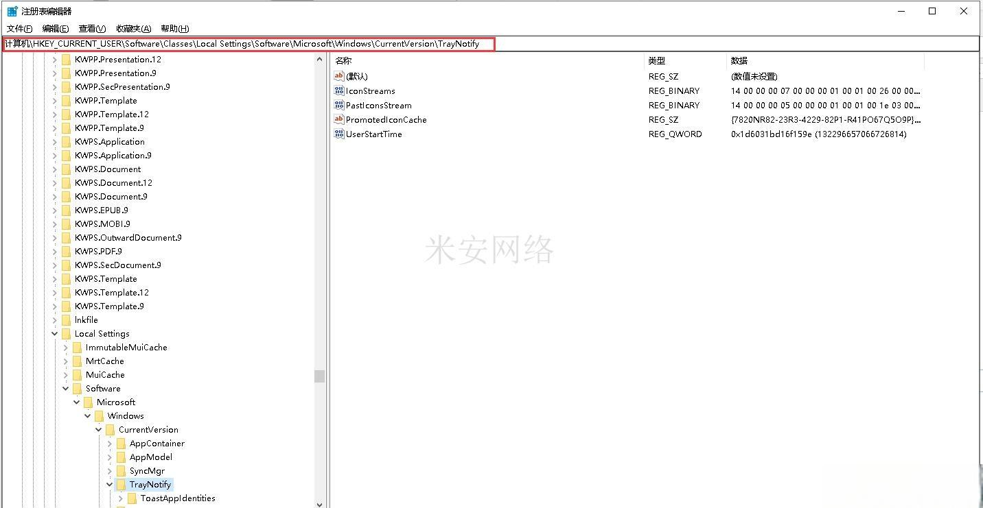 2.在文件夹定位到“HKEY_CURRENT_USER\Software\Classes\Local Settings\Software\Microsoft\Windows\CurrentVersion\TrayNotify”。